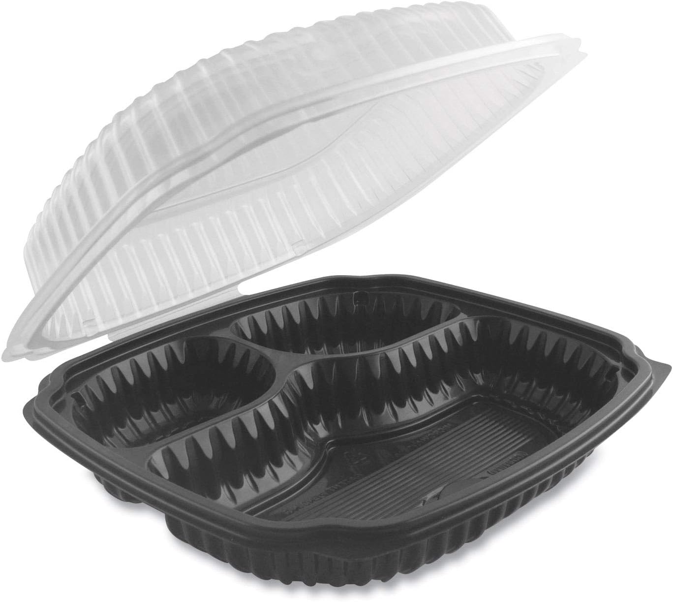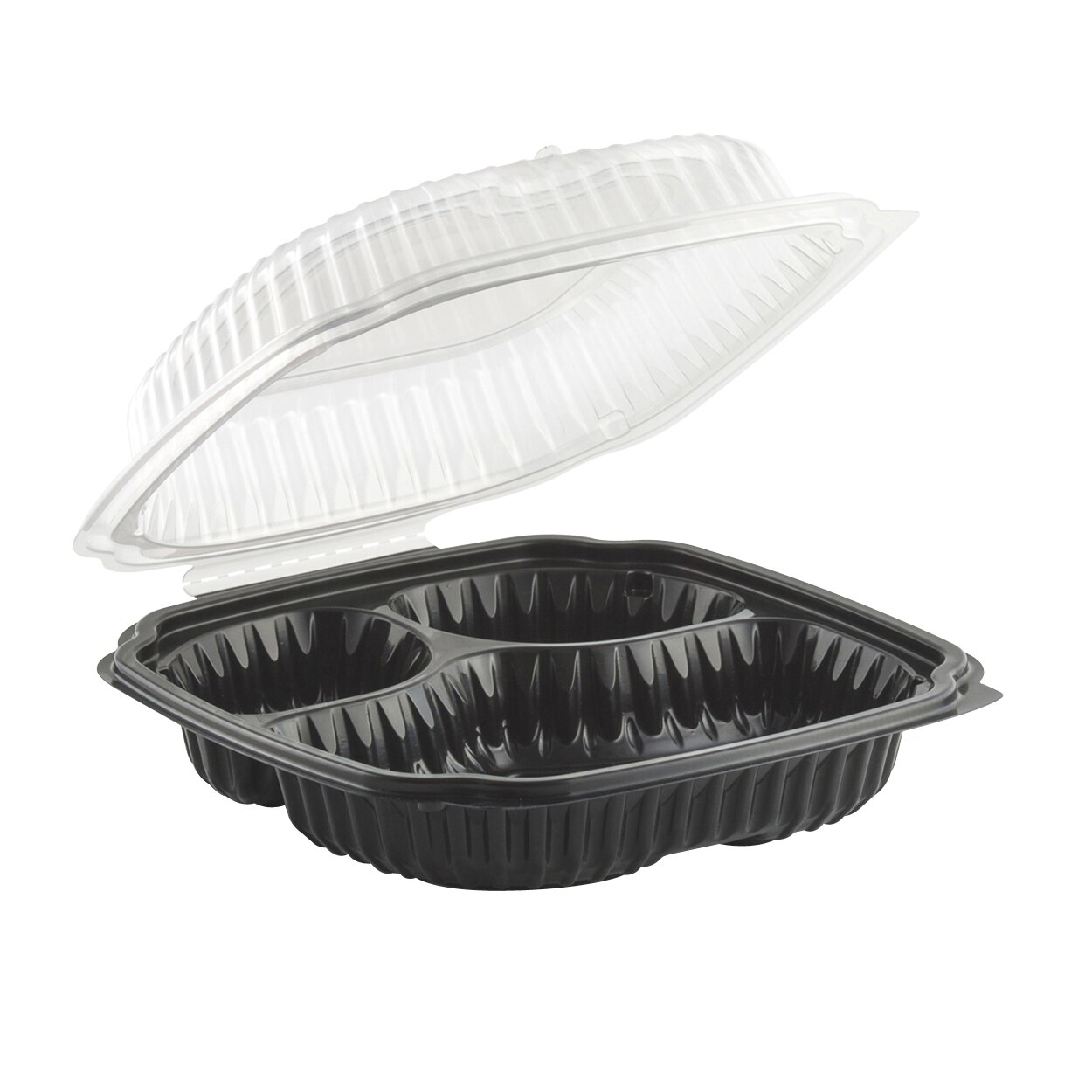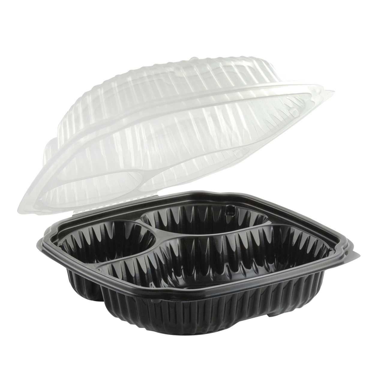 Black Plastic 3-Compartment Hinged Container - 20/5/5OZ 9" x 9", 100 per Case By Anchor