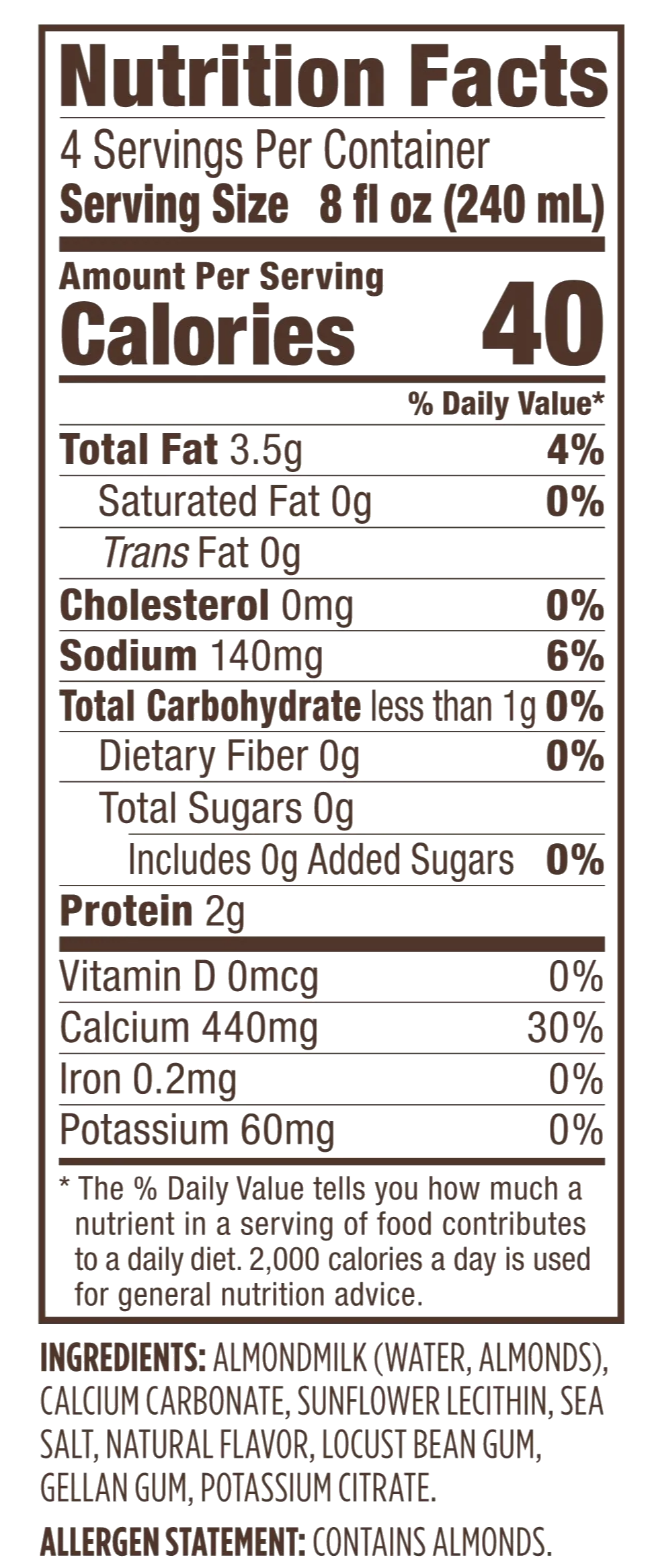 Ingredients: Almondmilk (Water, Almonds), Calcium Carbonate, Sunflower Lecithin, Sea sodium chloride, Natural Flavor, Locust Bean Gum, Gellan Gum, Potassium Citrate