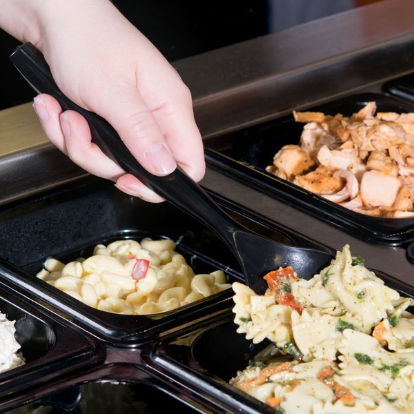 Serve your food in style with this Sabert 10" black disposable plastic serving spoon! This 10" spoon combines appearance and functionality into one great product. Serve up everything from pasta and potato salads to vegetable sides and more! Also, since each spoon is disposable, you can throw it away after the day is done for a quick and convenient cleanup!
