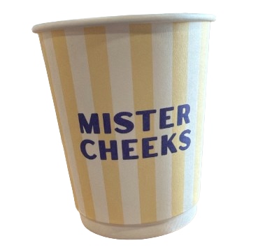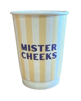 White and Yellow Stripped and blue letters Double Wall Paper Printed Hot Cup - 8 Oz, 500 per case by Mister Cheeks